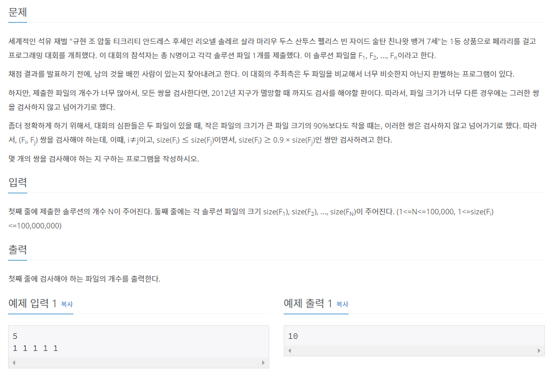 첫째 줄에 제출한 솔루션의 개수 N이 주어진다. 둘째 줄에는 각 솔루션 파일의 크기 size(F1), size(F2), ..., size(FN)이 주어진다. (1<=N<=100,000, 1<=size(Fi)<=100,000,000)