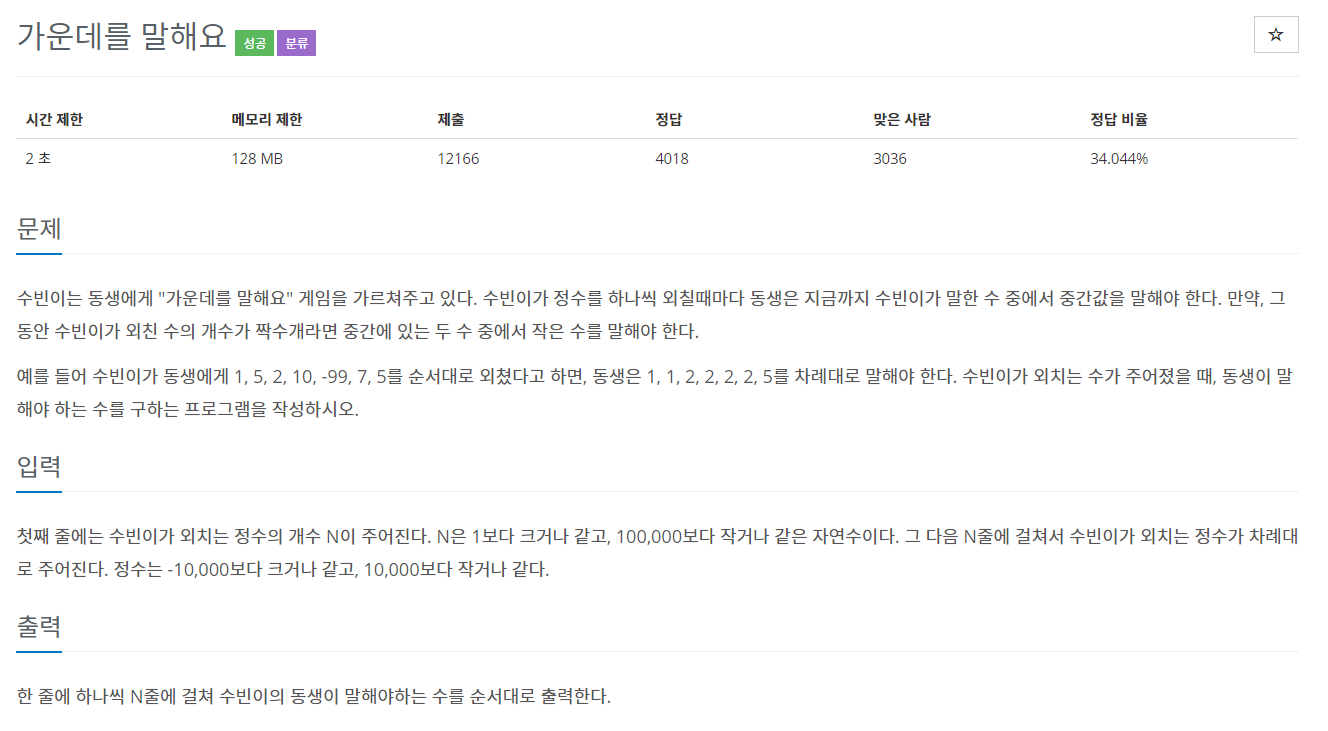 문제에서 요구하는 것은 수빈이가 어떤 수를 말할 때마다 그 수들의 가운데 있는 수를 찾아서 말하는 것이다.