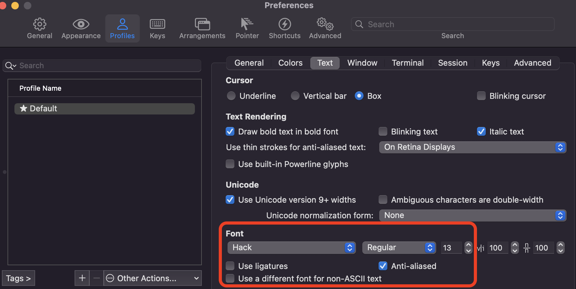 iTerm > Preferences > Profiles > Text 에서 원하시는 폰트/사이즈를 맞춰서 수정!