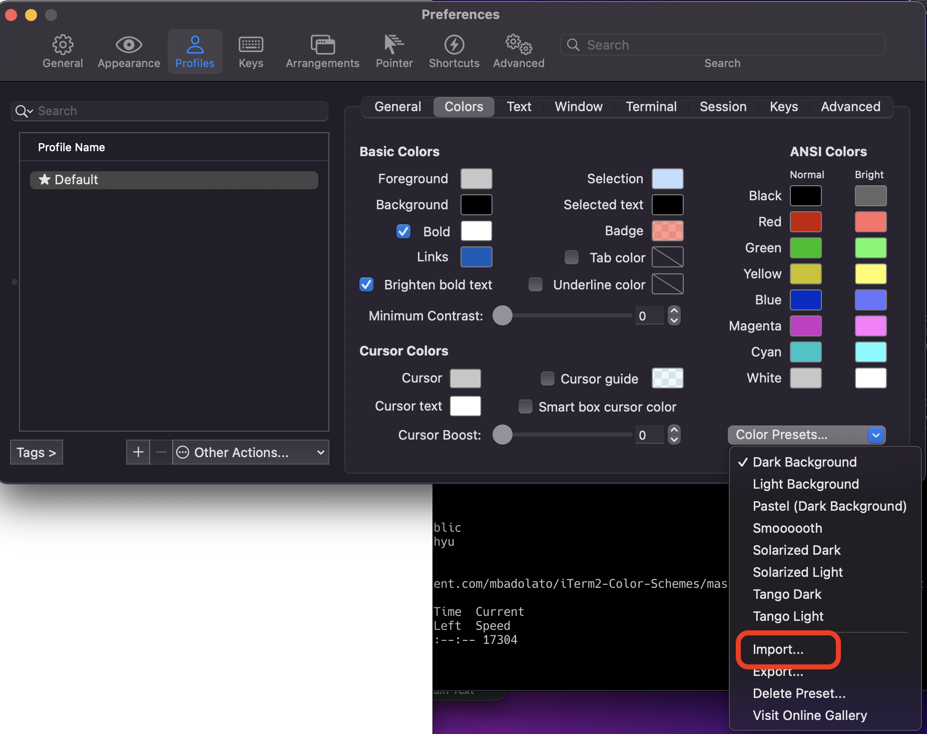 3) iTerm > Preferences > Profiles > Colors 에서 다운 받은 iterm themes를 import 해주고 선택해주면 끝!