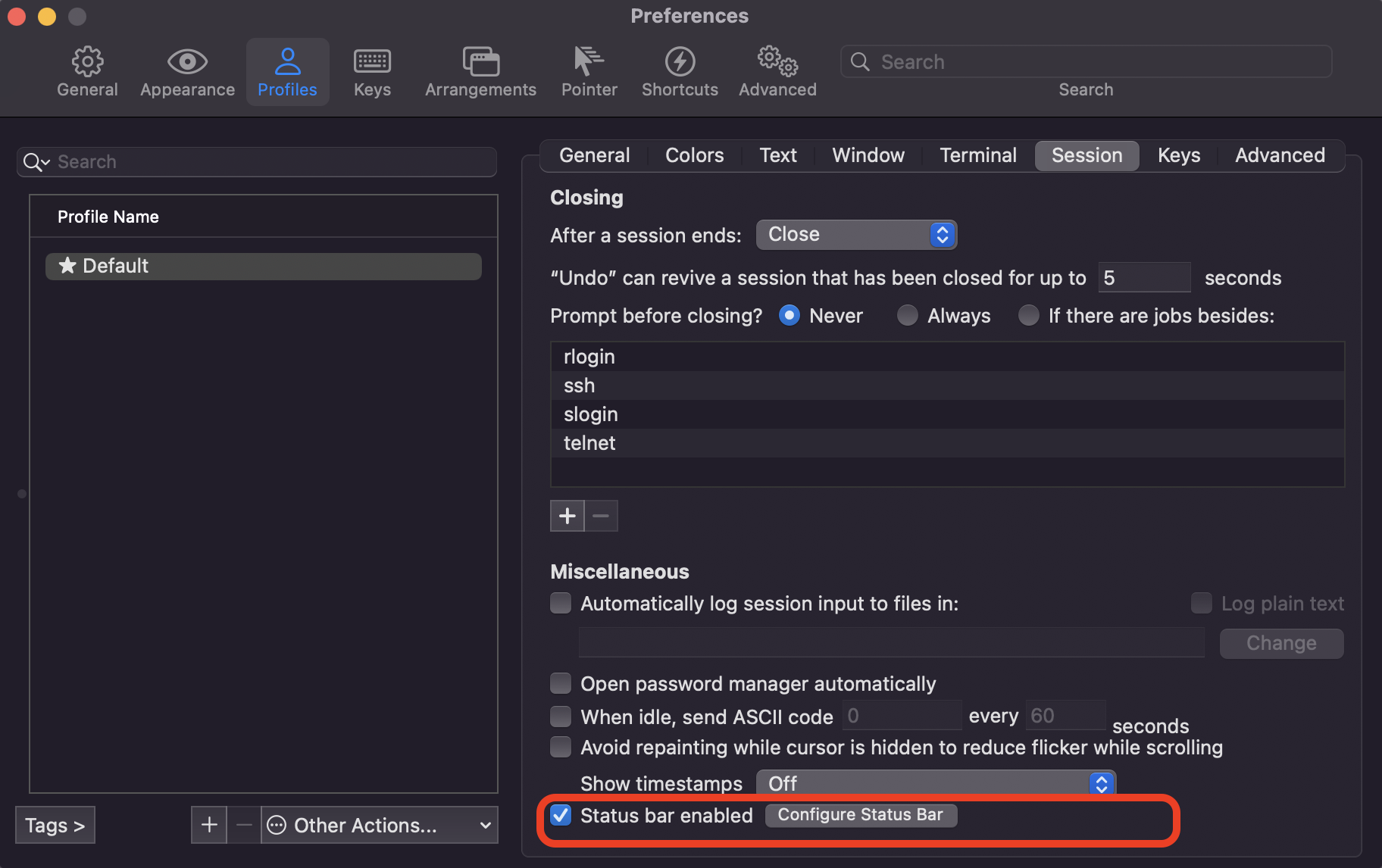 iterm2 > preferences > profiles > Session > status bar enabled 체크